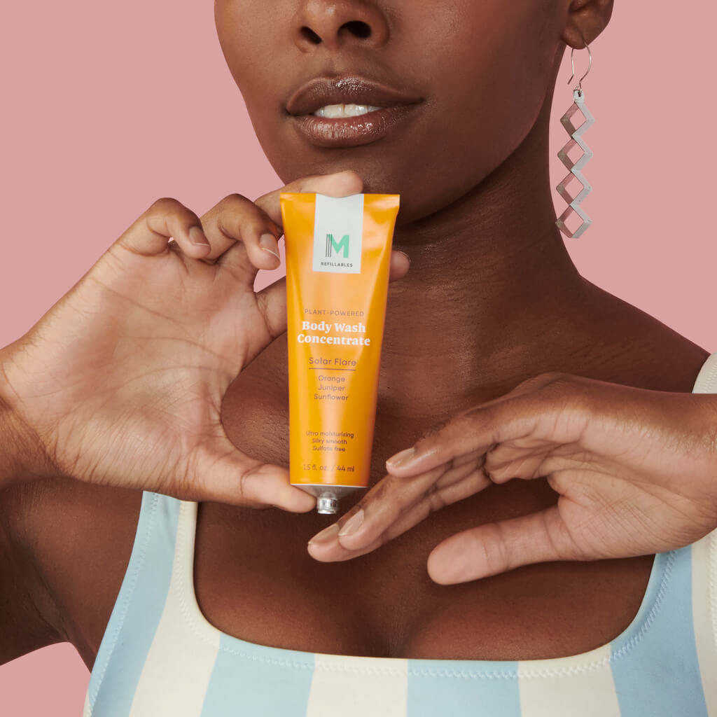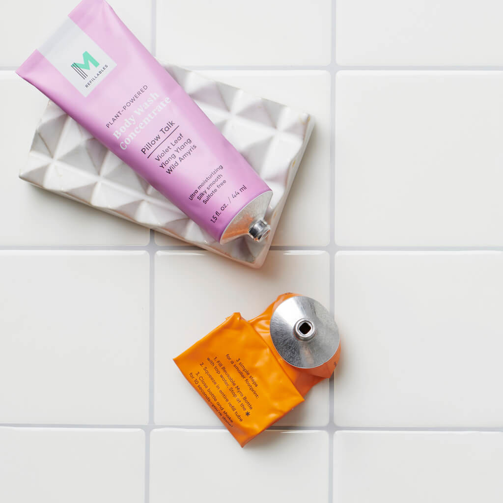 Our reusable body wash bottle is designed to withstand repeat in-shower use and occasional shelfie obsessions. Fill (and refill) with your favorite body wash concentrate in an infinitely recyclable aluminum tube.