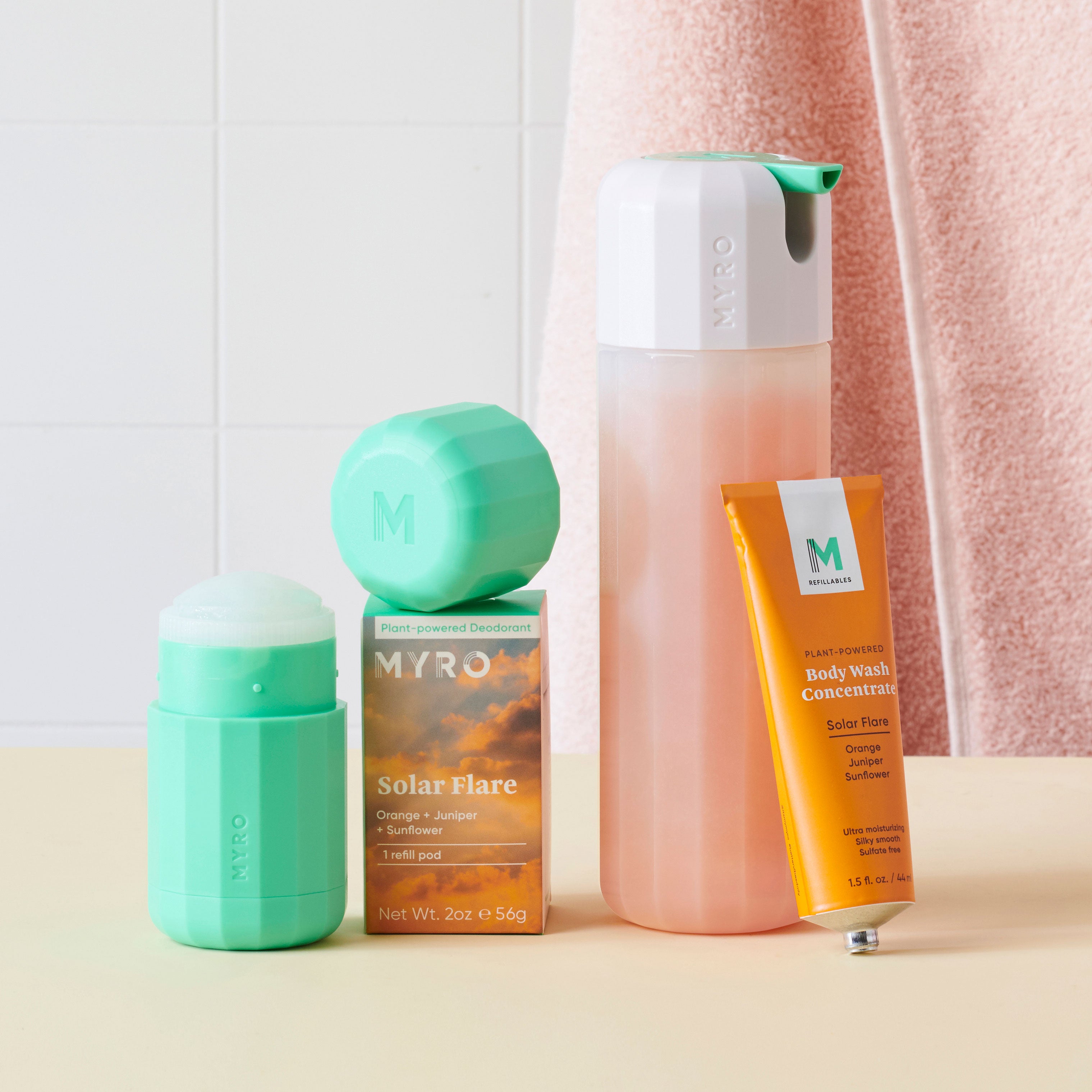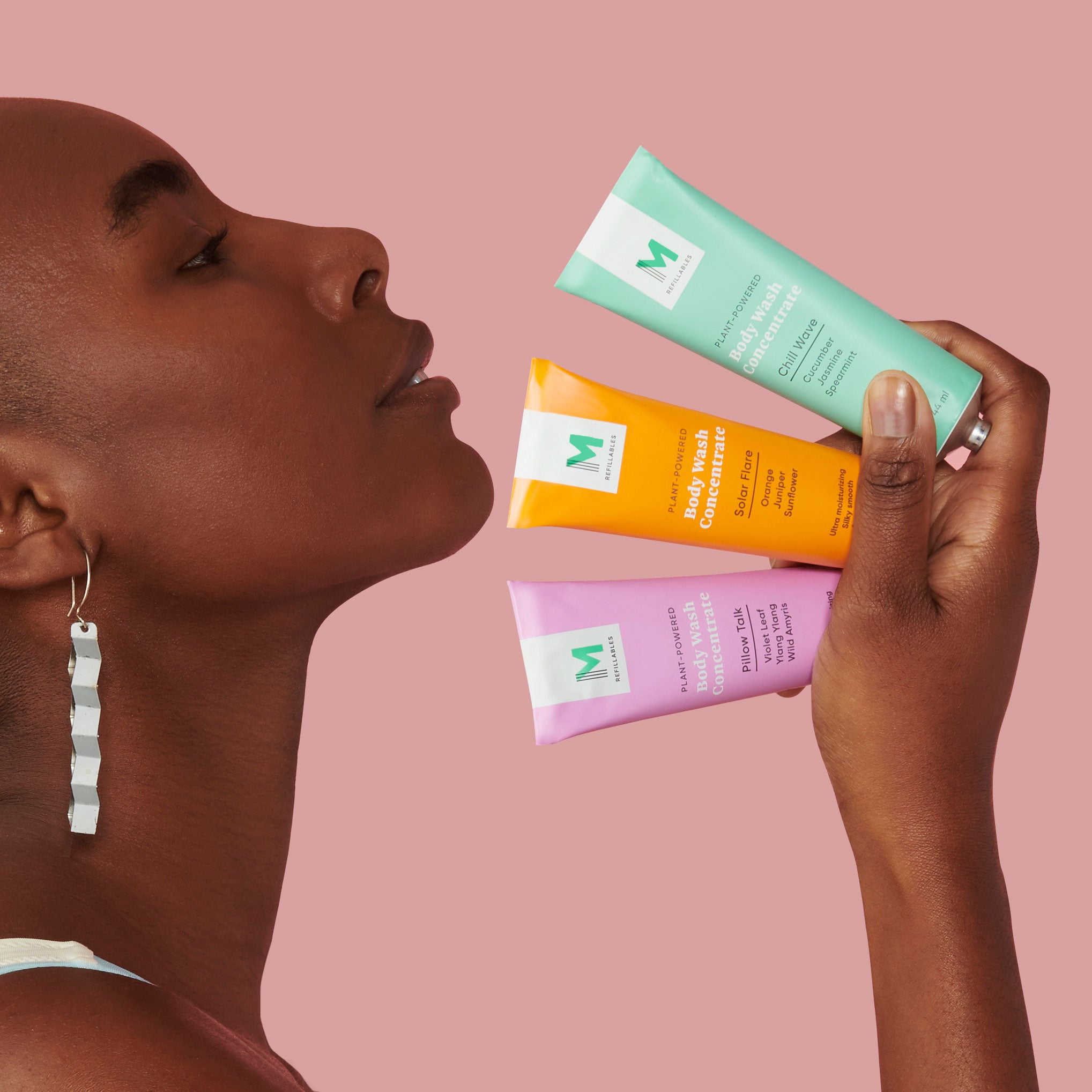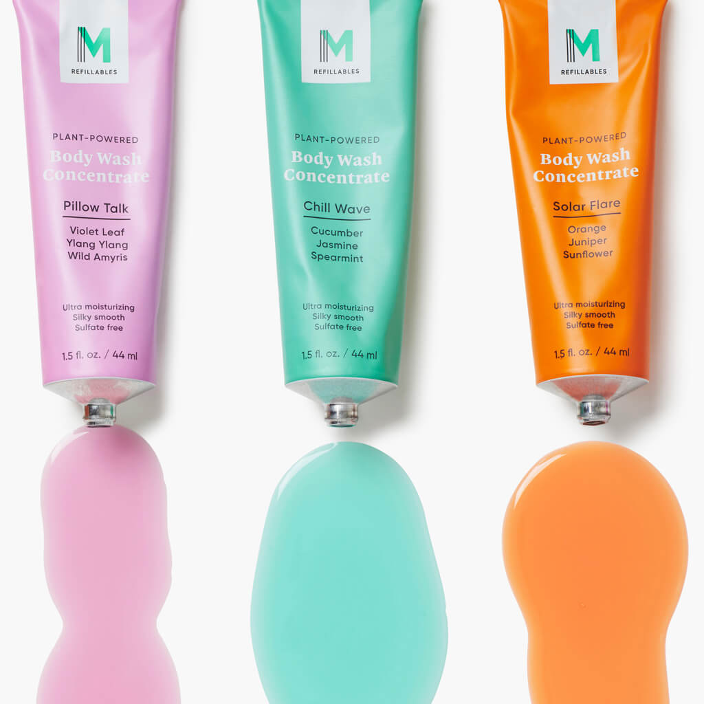 Ultra-moisturizing, sulfate‑free body wash concentrates in Solar Flare, Chill Wave and Pillow Talk scents. Just add water.